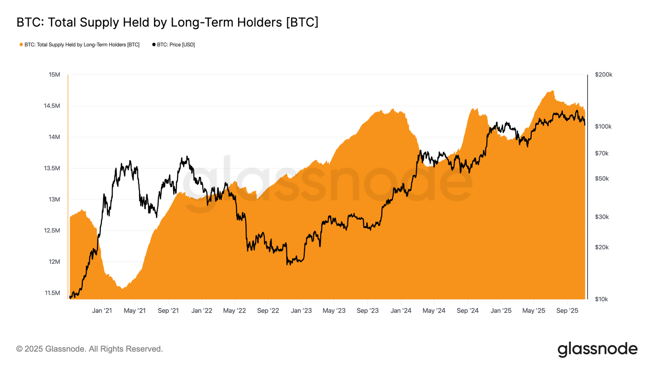 在此期間,長期持有者的比特幣持有量減少了約 30 萬枚(從 1470 萬枚降至 1440 萬枚)。與本輪週期早期的出售浪潮不同:當時長期持有者在大幅上漲期間「逢漲拋售」,而此次他們選擇「逢弱拋售」,即在價格盤整且持續走低時減持。這一行為轉變表明,經驗豐富的投資者已顯露出更深的疲憊感,信心有所下降。