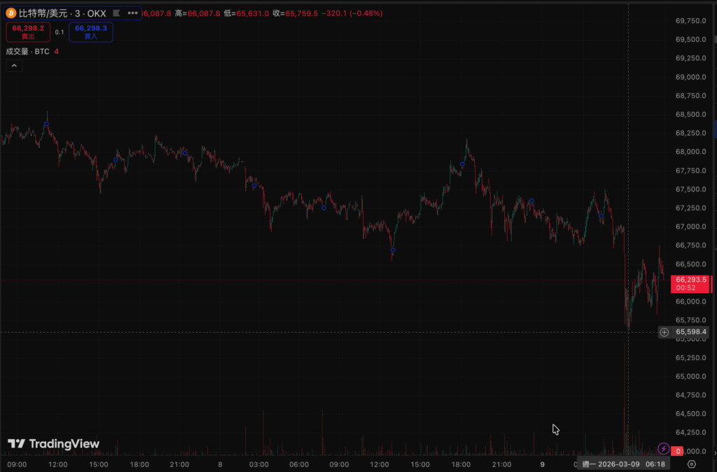 比特幣在週日晚間 18 時自 68,200 美元水位啟動跌勢,盤中一度跌穿 65,700 美元關卡,隨後小幅反彈,週一早盤暫報 66,323 美元,24 小時跌幅約 2.8%,比特幣在短短 15 分鐘內下跌近 2%,與油價飆升幾乎同步發生。
