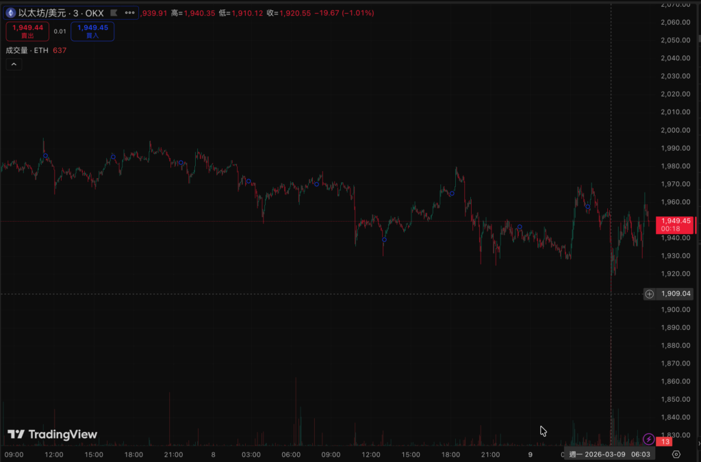 以太坊走勢同步偏弱,昨夜自 2,134 美元回落,下探 2,055 美元打底後止跌,早盤暫報 2,073 美元,24 小時跌幅約 2.9%。值得注意的是,比特幣上週曾因美伊衝突升溫一度攀升至 73,770 美元,但隨後連跌四日回吐全部漲幅。