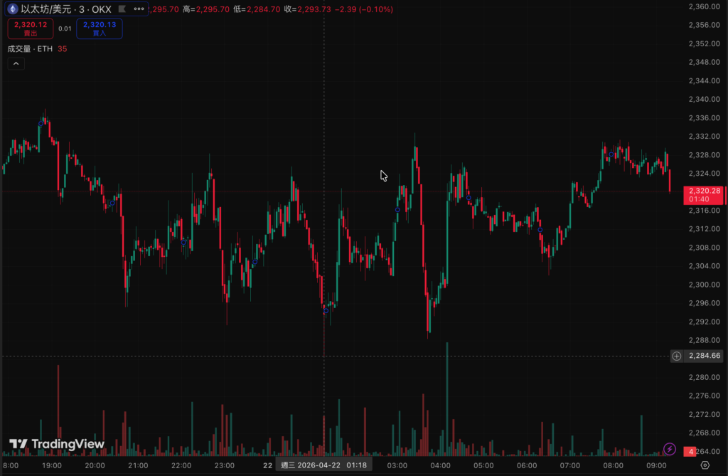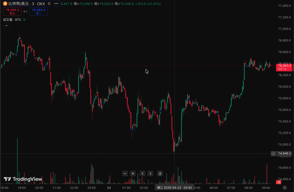 比特幣在歷經一輪 V 型反彈後,進入短線橫盤整理格局。自 4/13 17:00 觸及低點 $70,678 之後,市場買盤逐步回籠,今晨(4/22 09:00)現報 $76,323,24 小時在 $74,821–$76,927 的狹窄區間內反覆震盪。以太坊同步延續修復走勢:4/9 22:00 跌至 $2,164 低谷後,4/18 01:00 衝上 $2,451 峰值,今晨窄幅收復 $2,300 關口,現報 $2,324,24 小時漲幅 +0.12%。
