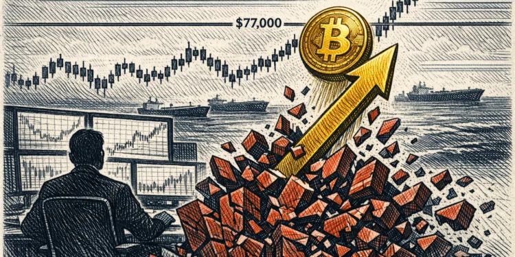 然而,讓這次上漲走得如此迅速的,是 $77,000 上方已經積累的龐大空頭部位。77k 上方堆積了約 11.7 億美元的空頭倉位,流動性牆在幾百美元的範圍內密集分布。