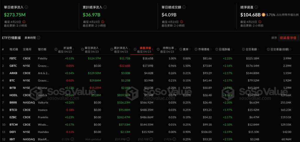 推動這波漲勢的關鍵力量,與美國現貨比特幣 ETF 的強勁資金流入有明顯的關係。特別是在美東 4 月 22 日,比特幣 ETF 單日淨流入高達 9.36 億美元,較前一日的 3.86 億美元暴增 146%,創下自 1 月 17 日以來最大的單日流入紀錄。