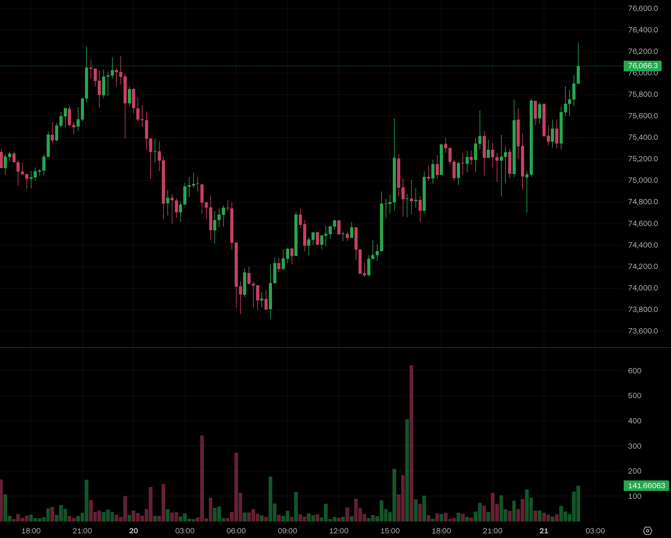 台灣時間 4 月 21 日凌晨 2 點左右,大盤迎來一波強勁的上漲動能。比特幣(BTC)價格短線突破 76,000 美元整數大關;與此同時,以太坊(ETH)也緊隨其後,成功站上 2,300 美元的關鍵水位。