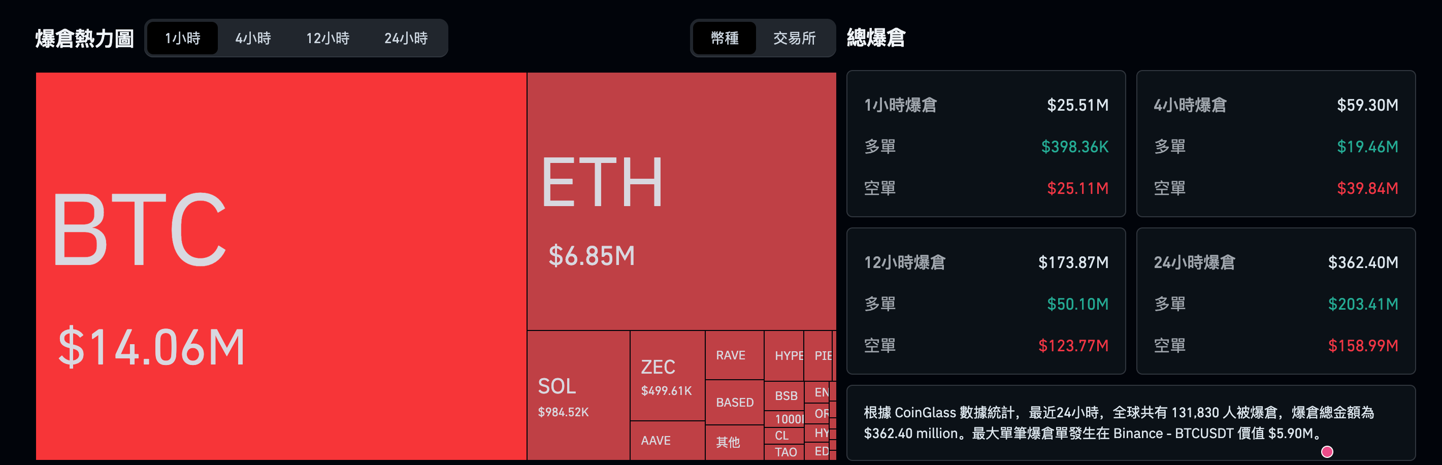 最大單筆爆倉 590 萬美元,發生在幣安