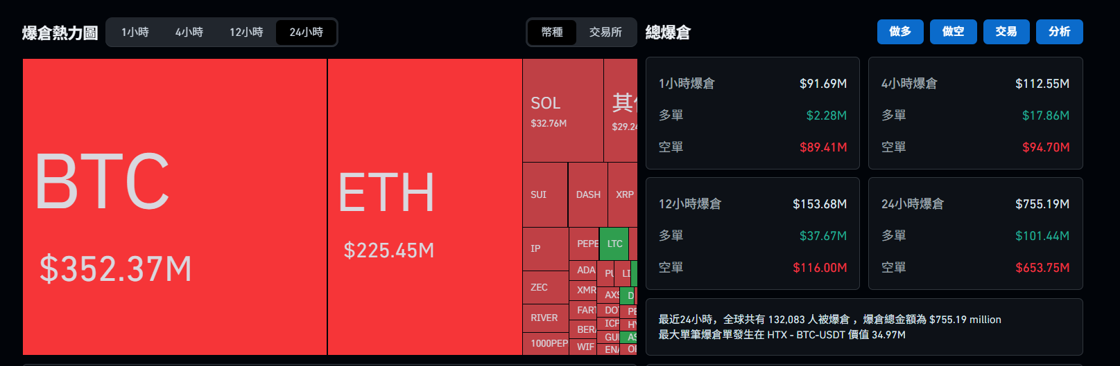 在這波強勢反彈行情中,據 Coinglass 數據顯示,過去 24 小時內,全網共有 13.2 萬人被爆倉,總爆倉金額約為 7.56 億美元。其中,多單爆倉約 1.01 億美元,而空單爆倉金額高達 6.59 億美元。