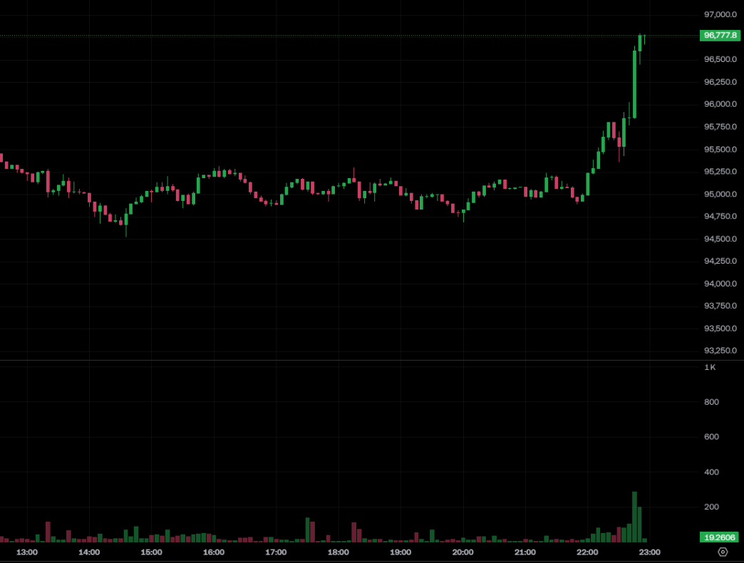 據最新市場數據顯示,比特幣在今(14)日晚間延續漲勢,幣價再次衝高,最高時突破 9.6 萬美元,來到 96,665 美元,近 24 小時漲幅高達 3.3%。以太坊同樣跟漲,幣價突破 3,300 美元,近 24 小時漲幅達到 5.1%。