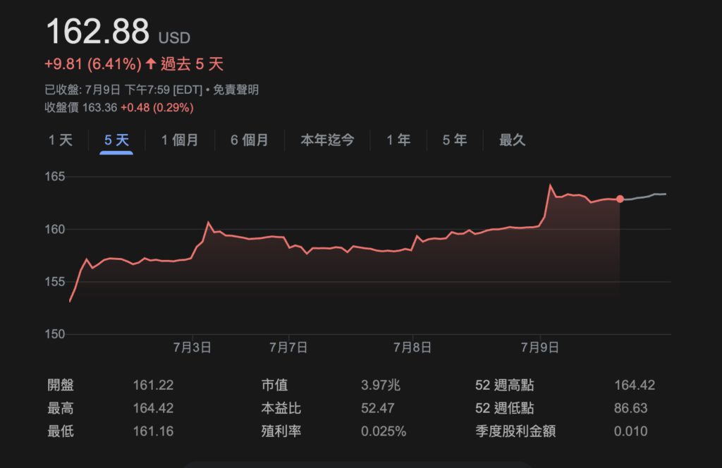 AI 晶片龍頭廠輝達(NVIDIA)盤中市值突破 4 兆美元大關,為史上首家達此門檻企業。終場漲勢收斂,收在 162.88 美元,漲幅約 1.8%。