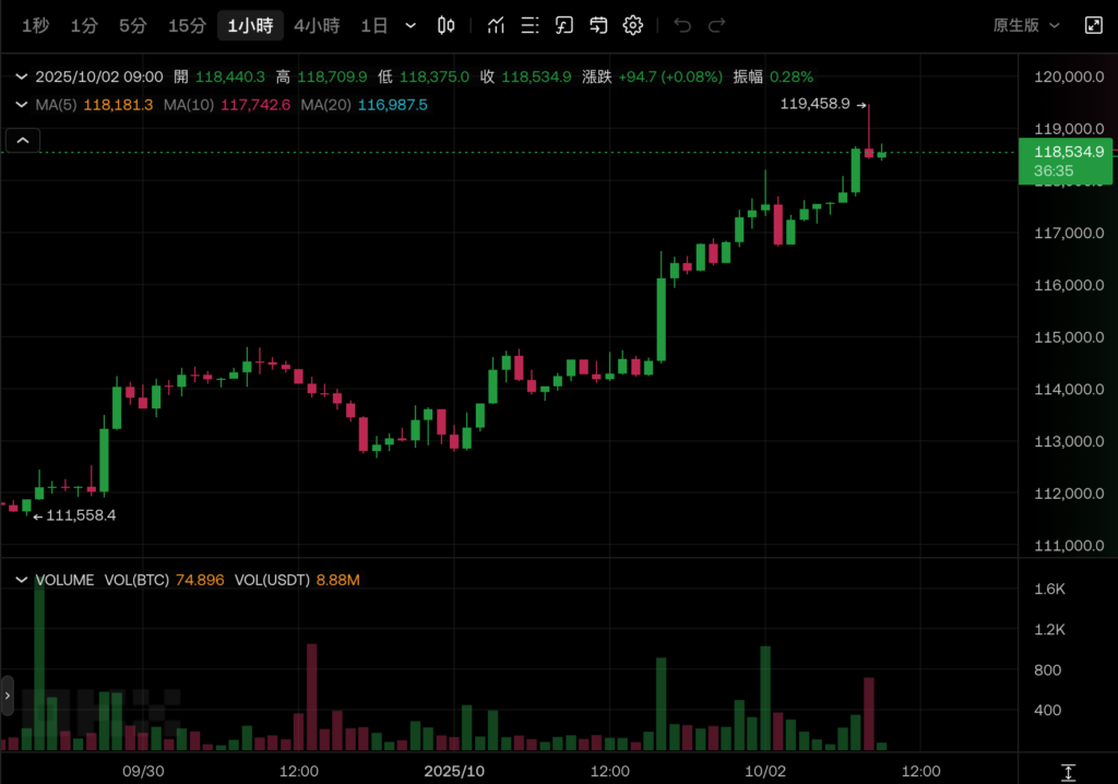 加密貨幣市場進入十月後持續拉漲,今(2)日清晨比特幣一度來到 11.94 萬美元,寫下一個半月來最高。撰稿當下暫報 118,534 美元,近 24 小時漲幅為 3.6%;以太坊同樣上升,當前暫報 4,353 美元,近 24 小時漲幅為 4.83%。