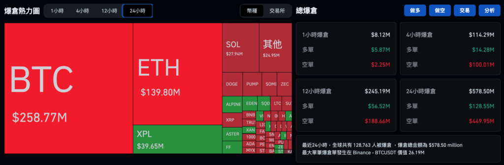 據 Coinglass 數據顯示,在這波反彈行情中,過去 24 小時內全網共有 128,763 人遭到清算,爆倉總金額約為 5.7 億美元;以空單遭清算 4.49 億美元居多。