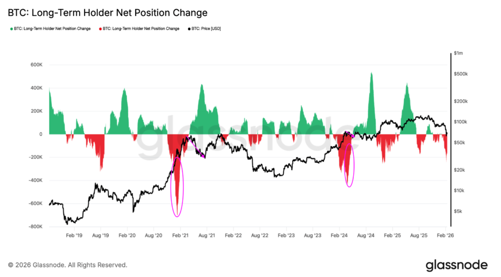 根據 Glassnode 的長期持有者(LTH)淨部位變化數據,持有超過 30 天的投資者在 2 月 6 日單日減持了 245,000 枚比特幣,創下本輪週期的極端紀錄。此後,該群體平均每日持續減持約 170,000 枚 BTC。