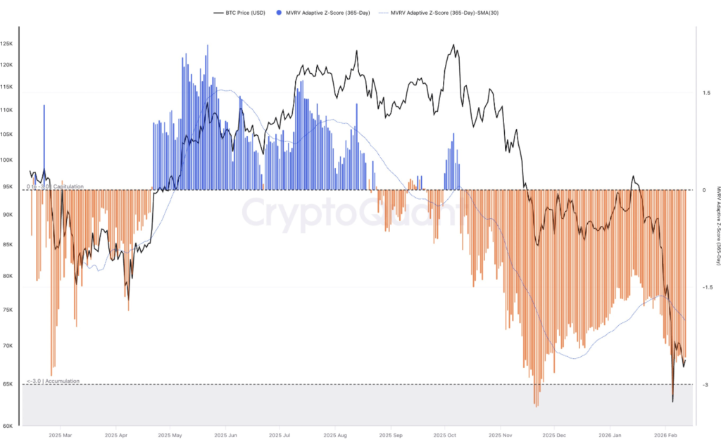 CryptoQuant 的數據顯示,比特幣的 MVRV 自適應 Z-Score(365 天窗口)已跌至 -2.66,進一步佐證了當前拋壓的嚴峻程度。