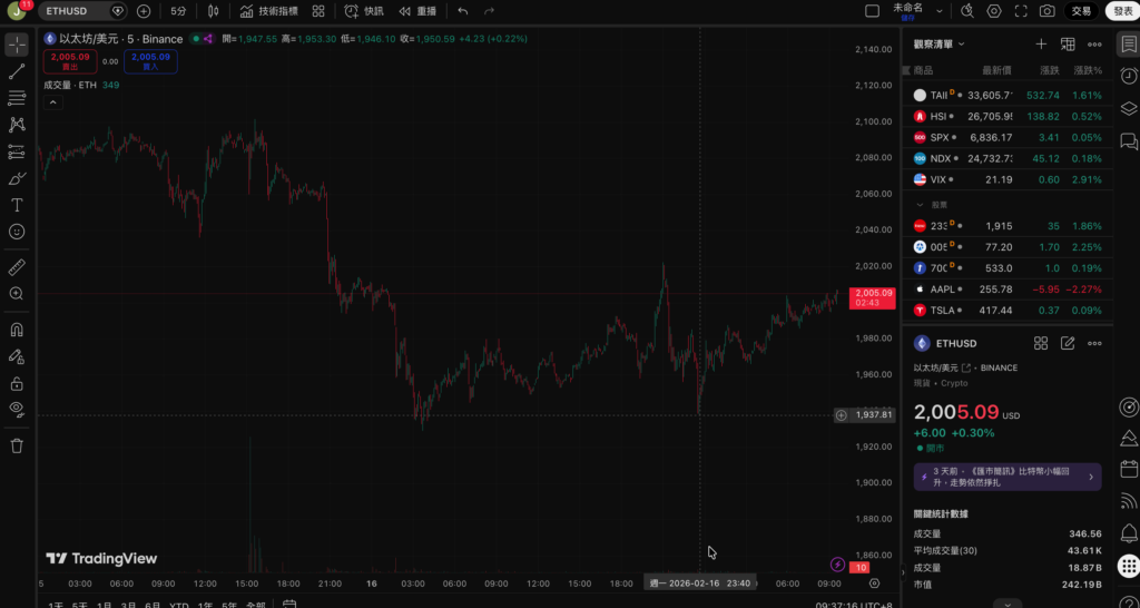 以太坊(ETH)同樣經歷類似走勢,從 2,022 美元一度插針至 1,937 美元以下,隨後快速反彈至 2,033 美元。雖然幅度不大,但新的農曆一年確實是由漲幅拉開序幕,為市場注入一劑強心針。