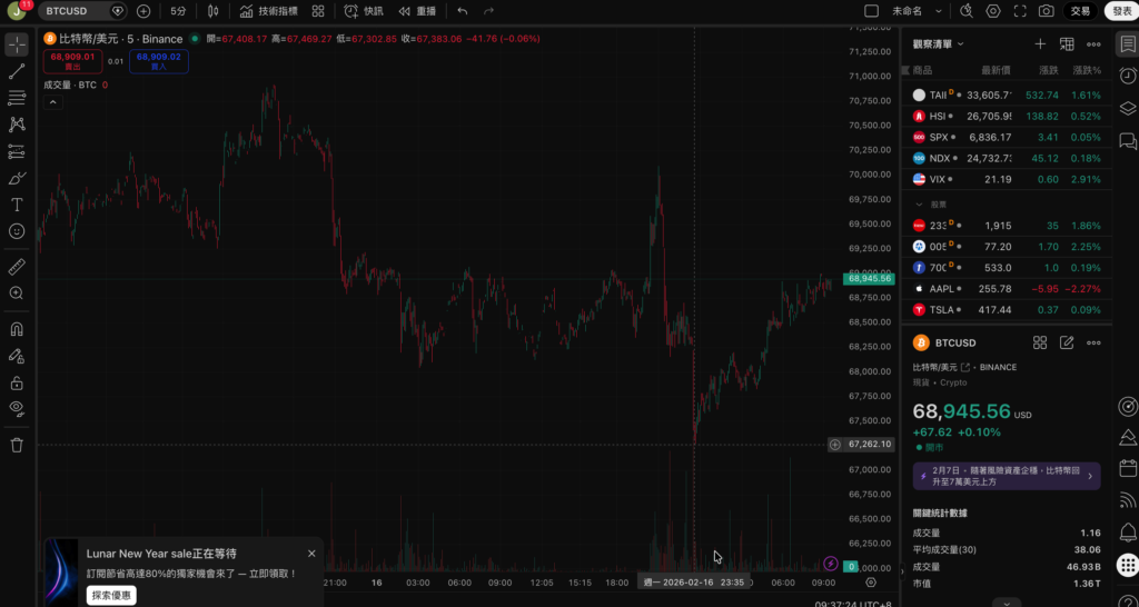 比特幣在農曆蛇年除夕夜(2 月 16 日)迎來一場驚心動魄的深V行情。BTC 從 70,100 美元一度跳水至 67,274 美元,跌幅超過 4%,但在新年拜天公時刻過後市場買盤迅速回補,價格持續緩漲至 68,945 美元,為馬年開出了「虛驚一場」的紅盤。