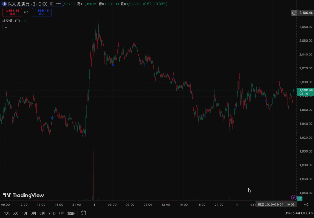 比特幣自昨夜晚間一度跌至 66,140 美元水位後,凌晨開始反彈至近 69,000 美元,隨後持續震盪,截稿報 68,549 美元。以太坊(ETH)走勢如出一轍,從 1,929 美元回衝 2,000 美元後回落,現報 1,990 美元。