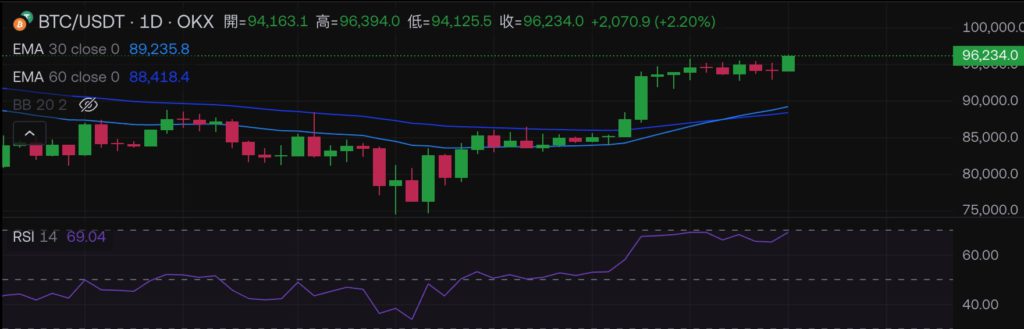 技術指標也提供了一些線索:日線圖上的相對強弱指數(RSI)約在 66~69 左右,顯示市場仍未進入超買階段、移動平均線的趨勢也支持價格進一步上漲。