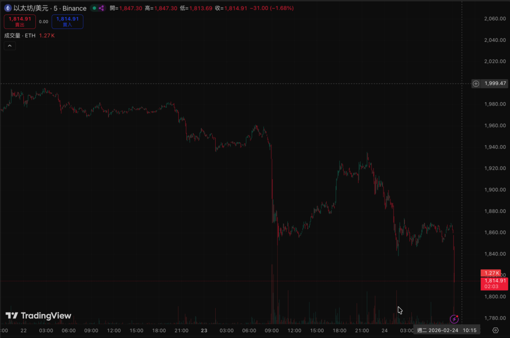 比特幣今(24)日清晨隨美股重挫一度跌破 64,000 美元大關,現回穩至約 64,770 美元;以太坊跌幅相對較小,一度觸及 1,843 美元後回升至 1,859 美元。美股週一三大指數低開低走,道指收跌 1.66%、標普 500 跌 1.04%、納指跌 1.13%,科技股成重災區。