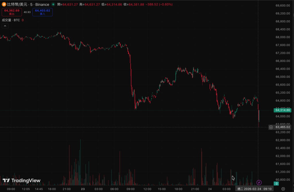 比特幣在今日清晨四點左右,隨著美股週一(2/24)收盤重挫而一度跌破 64,000 美元關口,而今早又跌破64000美元水位,一度跌至最低63465美元,現報 64314 美元,,但整體市場情緒仍處於「極度恐慌」狀態,恐懼與貪婪指數持續在低檔徘徊。