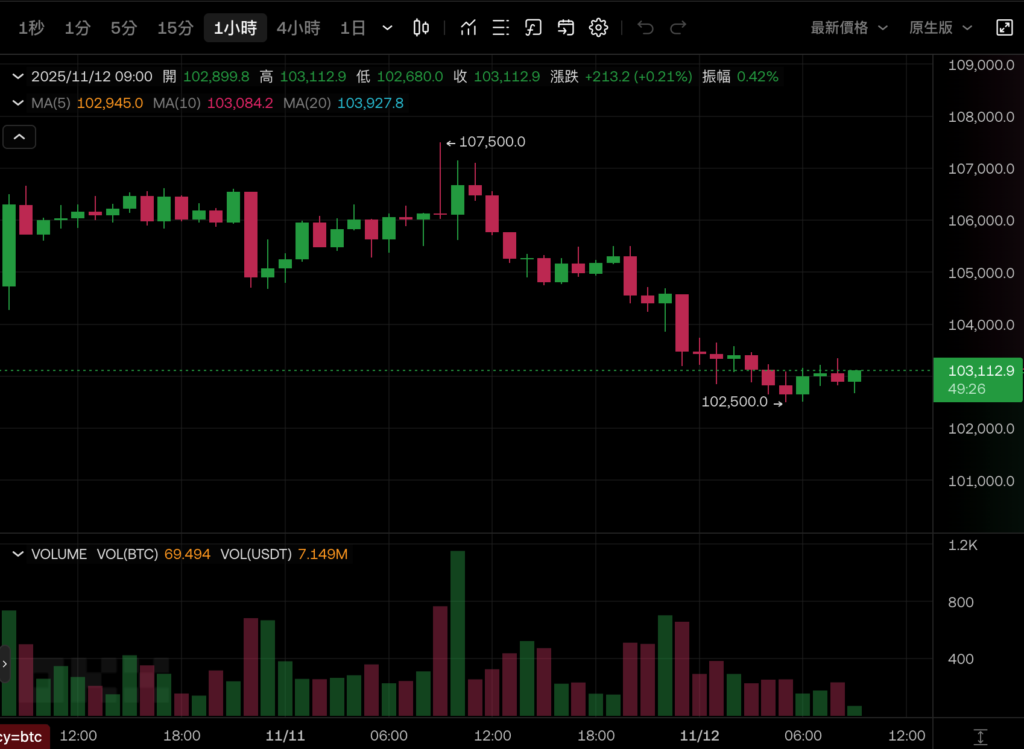 比特幣今(12)日清晨五點多,價格一度失守 103,000 美元,最低觸及 102,500 美元。撰稿當下有小幅回彈來到 10.3 萬美元,日跌近 3%。距離 10 月高點 126,000 美元跌幅已約兩成。