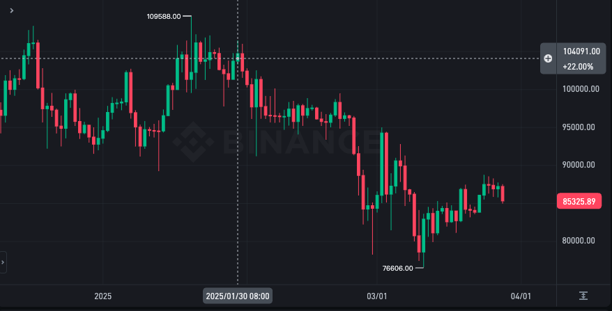 Michael Saylor 登上富比士封面的時間點,是在川普就職典禮後不久。從比特幣價格線圖來看,可以說是近期高點,並且比特幣在隨後的下跌趨勢中,最高跌幅將近 23%。