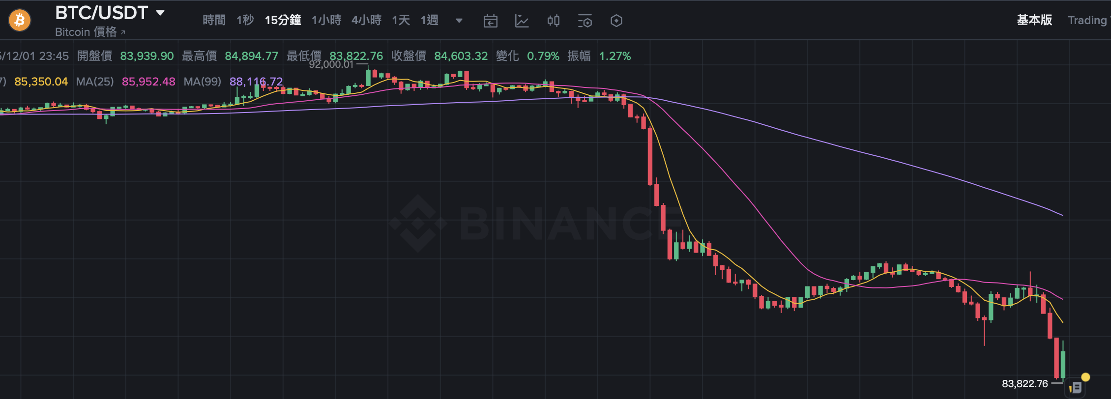 BlockTempo 消息,比特幣在晚間 11 點 57 分在幣安現貨市場跌破 8.4 萬美元,最低觸及 83,822 美元,過去 24 小時跌幅為 7.4%,依 Coinglass 清算統計,過去 24 小時累計爆倉金額達 3.76 億美元。