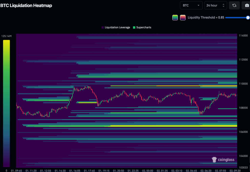 槓桿部位正成為市場隱憂。雖然比特幣月度期貨年化溢價維持在 7% 的中性區間,但 Deribit 七天期權偏斜率已連續一週顯示賣權溢價高於買權,做市商普遍押注短線走弱。Coinglass 清算熱力圖進一步警告,如果價格跌破 107,000 美元,約 3.9 億美元多頭槓桿將被迫平倉,可能引發瀑布式下跌。歷史數據顯示,9 月常是比特幣表現最疲軟的月份,市場對 10.8 萬美元支撐抱持高度疑慮。