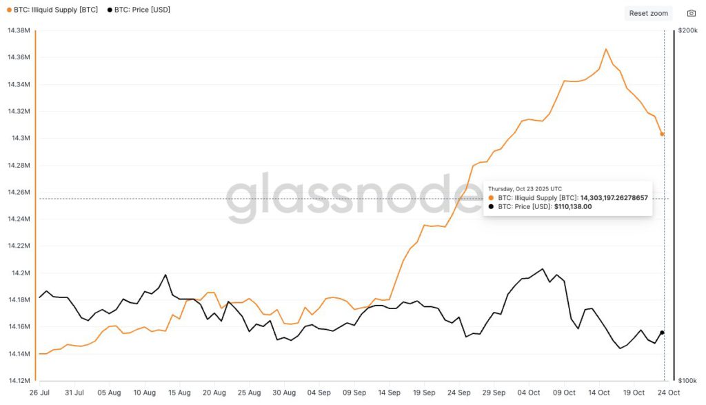 所謂非流動性供給,可想像成鎖在保險箱裡的黃金,平時不參與買賣。當保險箱打開、黃金被拿到店面,雖然整體存量未變,但市面流通量卻瞬間上升。Glassnode 指出,今年的幣價上漲與非流動性供給密切相關,這是 2025 年下半年以來首度出現的明顯下降,幅度大到足以撼動市場結構。更敏感的是,比特幣目前在 11.5 萬美元附近盤整,正處於多空力量重估的位置;若新增籌碼找不到對手盤,賣壓將順勢擴散。