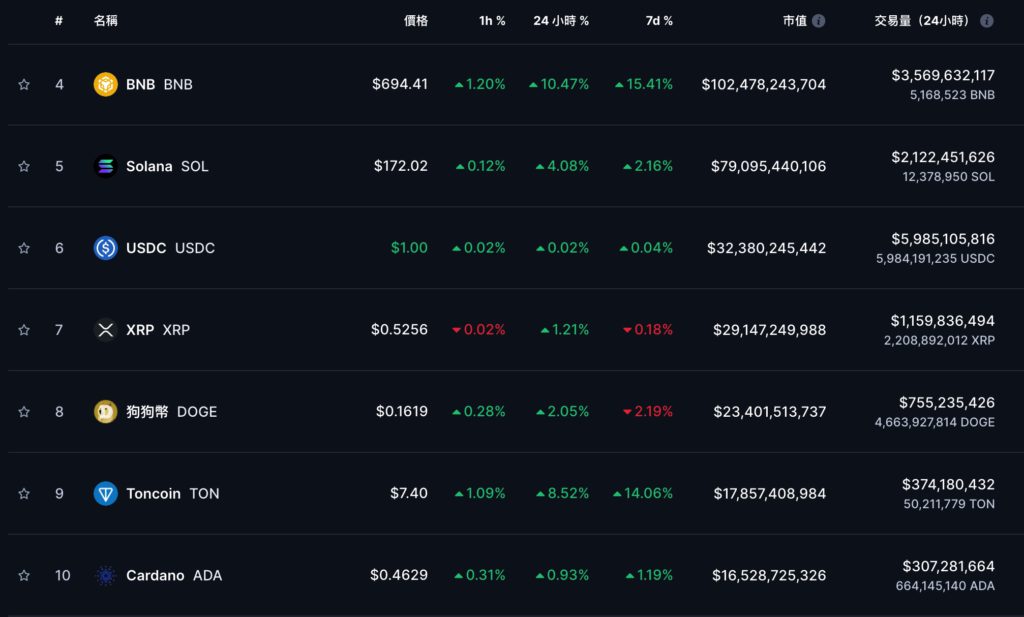 CoinMarkeCap 數據顯示,其他前十大代幣近 24 小時也全數拉漲,其中 BNB 突破 690 美元,上漲 10.47% 表現最為強勢、次高的則是 TON 有 8.5% 的漲幅。