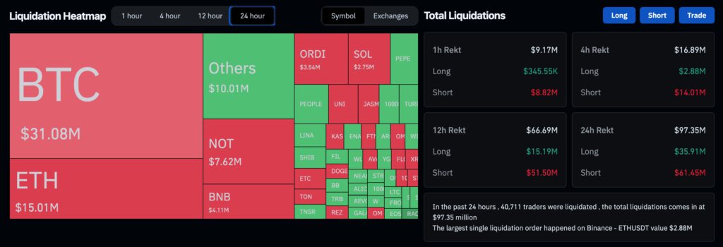 比特幣拉漲的行情下,據 Coinglass 數據顯示,過去 24 小時,加密貨幣全網爆倉金額超過 9700 萬美元(空頭佔 6100 萬美元居多),約有超 4 萬人遭清算。