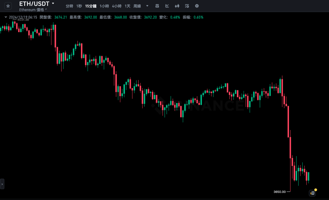 同樣地,以太坊也在利率決議公布後,從高點 3907 美元開始下跌,一度插針 3650 美元,短時跌幅達 6.6%。截稿前現報 3681.05 美元,近 24 小時下跌 6.14%。