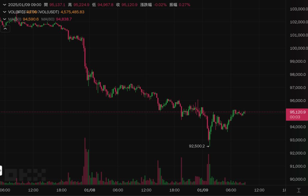今(19)日午夜一點半左右,比特幣快速插針至 92,500 美元,創下 2025 年最低紀錄。不過似乎是已經達到空軍目標價格,比特幣隨後開啟一波反彈,截稿前現報 95,120 美元,近 24 小跌幅縮小至 1.84%。