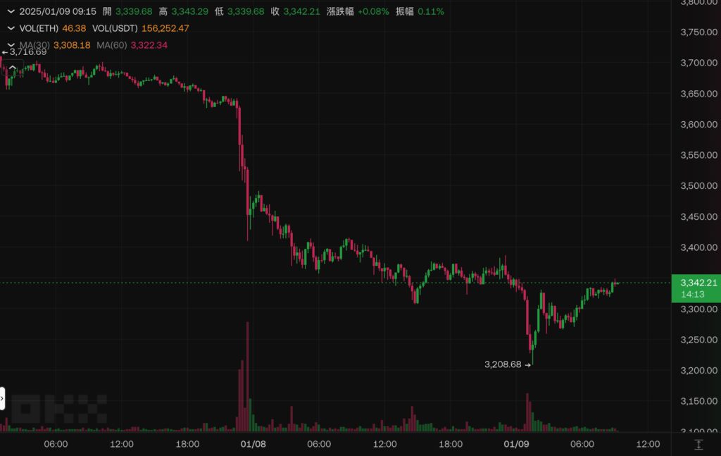同時間,以太坊也一度插針 3208 美元,截稿前反彈回 3342 美元,近 24 小時下跌 1.61%。