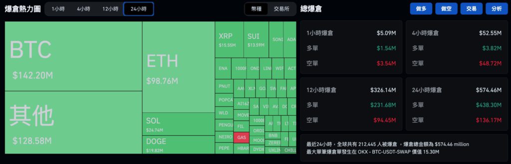 另一方面,根據 Coinglass 數據顯示,過去 24 小時,加密貨幣全網爆倉金額達 5.74 億美元,多單爆倉 4.38 億美元居大宗,空單爆倉 1.36 億美元,有超過 21.2 萬人被清算。