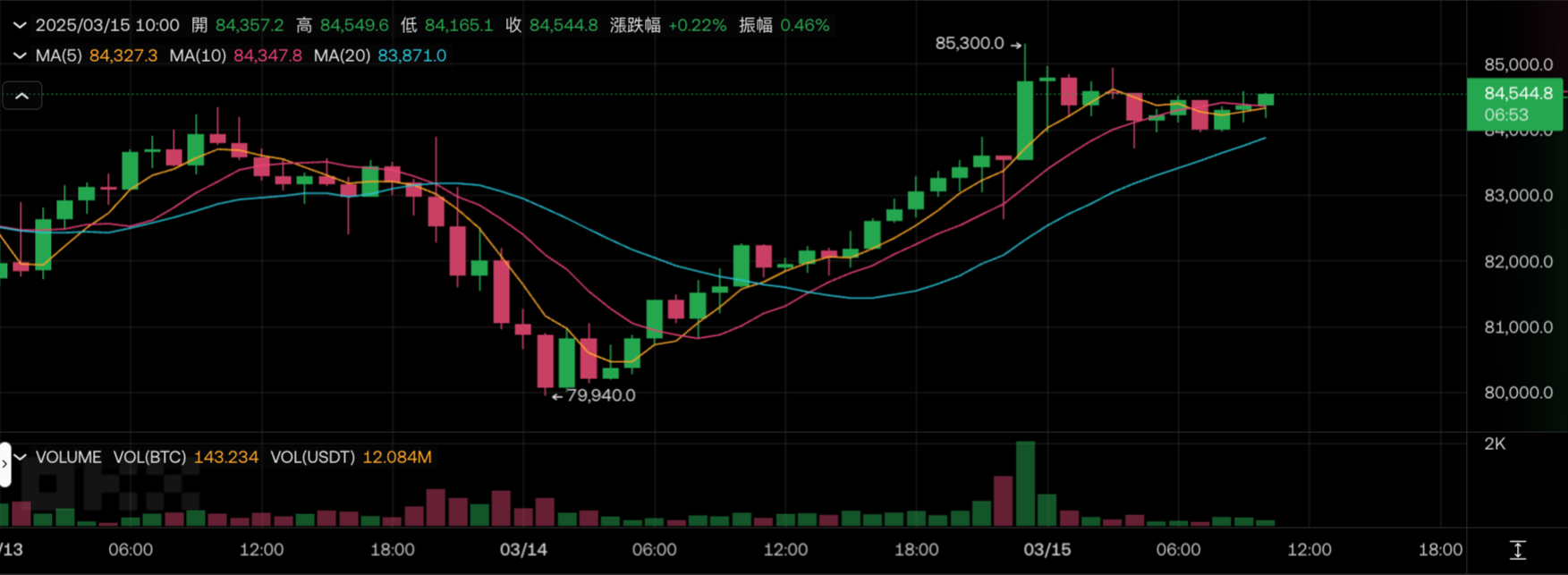 比特幣 15 日凌晨衝破 85,000 美元,從週五低點 79940 美元強漲 6.7% 至 85300 美元高點,截稿前暫報 84544 美元,近 24 小時上漲 3%。