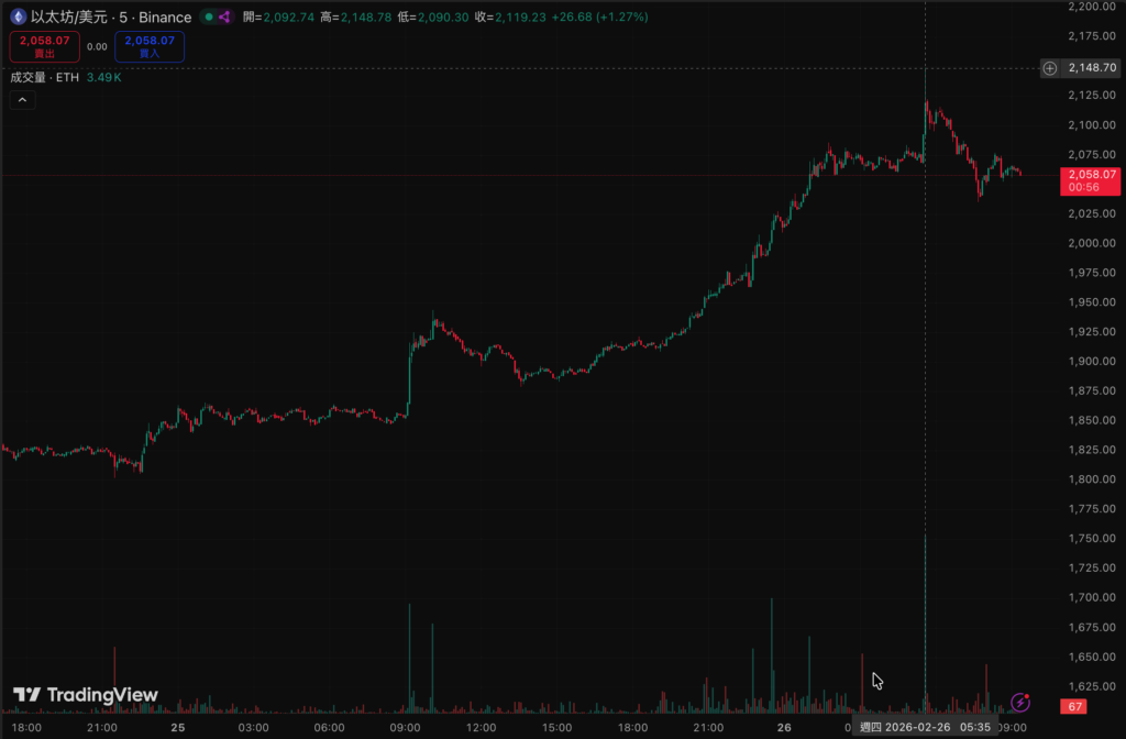 以太坊同步迎來反彈行情,從昨晚的 1,900 美元起漲,一度強勢衝破 2,148 美元大關。不過與比特幣如出一轍,ETH 同樣未能守住高點,現已回落至 2,058 美元附近盤整。