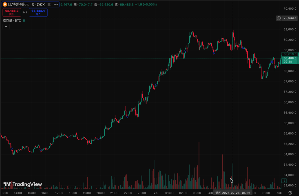 比特幣自昨晚七點左右啟動一波凌厲攻勢,從 65,000 美元水位一路向上挺進。多頭氣勢如虹,短短十個小時內便將價格推升超過 5,000 美元。今日凌晨五點多,BTC 更一度插針觸及 70,048 美元,短暫突破 7 萬美元整數心理關卡。然而,多方攻勢未能延續,價格隨即在數分鐘內快速回落,截稿時報 68,439 美元。