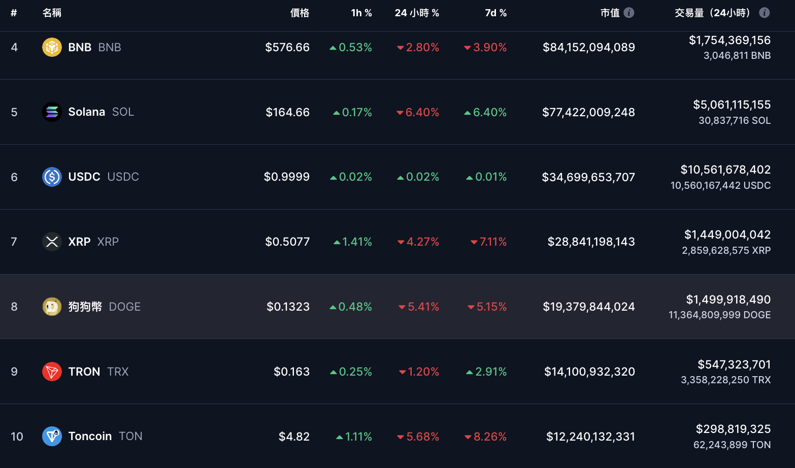 CoinMarkeCap 數據顯示,其他前十大代幣近 24 小時齊跳水,近期較為強勢的 SOL 回落至 164.66 美元,下跌 6.4%;DOGE 和 TON 也都有超過 5% 的跌幅,幣價分別現報 0.1323 美元和 4.82 美元。