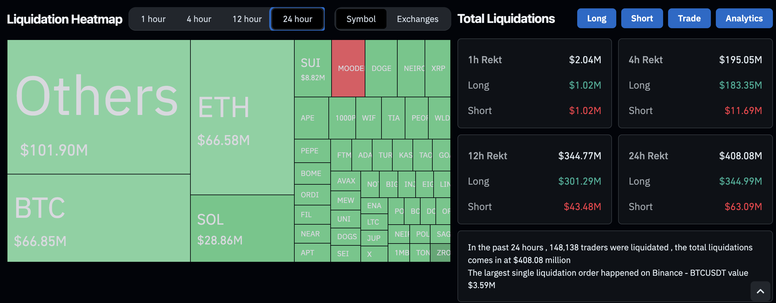 在這背景下,據 Coinglass 數據顯示,過去 24 小時,加密貨幣全網爆倉金額超過 4.08 億美元,主爆多單,金額占據 3.45 億美元,有超過 14.8 萬人遭到清算。