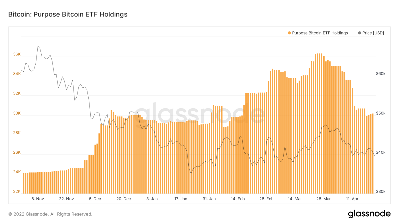 On Chain Labs 進一步指出,在今年 1 月時,Purpose Bitcoin ETF 持倉量最高曾達到 3.6 萬顆比特幣,目前卻已降至 3 萬顆,持倉量足足下滑了 20%,這表明機構方很可能是在預期聯準會即將啟動激進貨幣緊縮週期之前,採取規避風險策略。