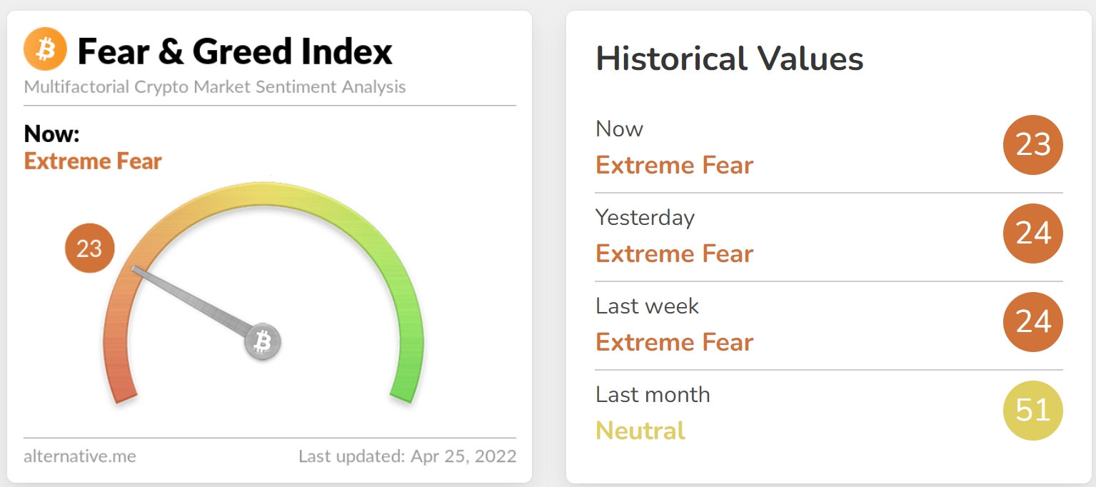 隨著加密貨幣市場近期陷入低迷,Alternative.me 數據顯示,加密貨幣市場恐懼與貪婪指數(Crypto Fear & Greed Index)最近 1 週以來一直維持在「極度恐懼」狀態,上週為 24 ,目前降至 23 。