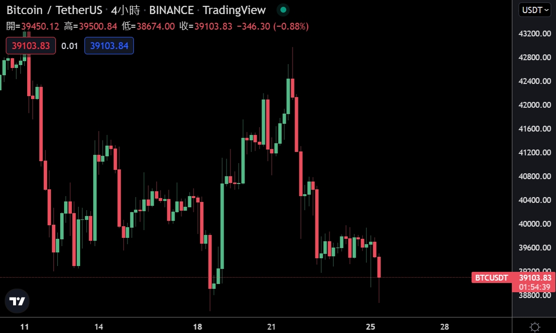 據 Tradingview 數據,比特幣(BTC)在 21 日突破達到 4.3 萬美元後開始持續下探,繼 22 日跌破 4 萬美元大關後,今日又進一步跌破 3.9 萬美元,觸及 38,693.12 美元低點,至截稿前,略為回升至 39,103 美元,近 24 小時跌幅 1.21%。
