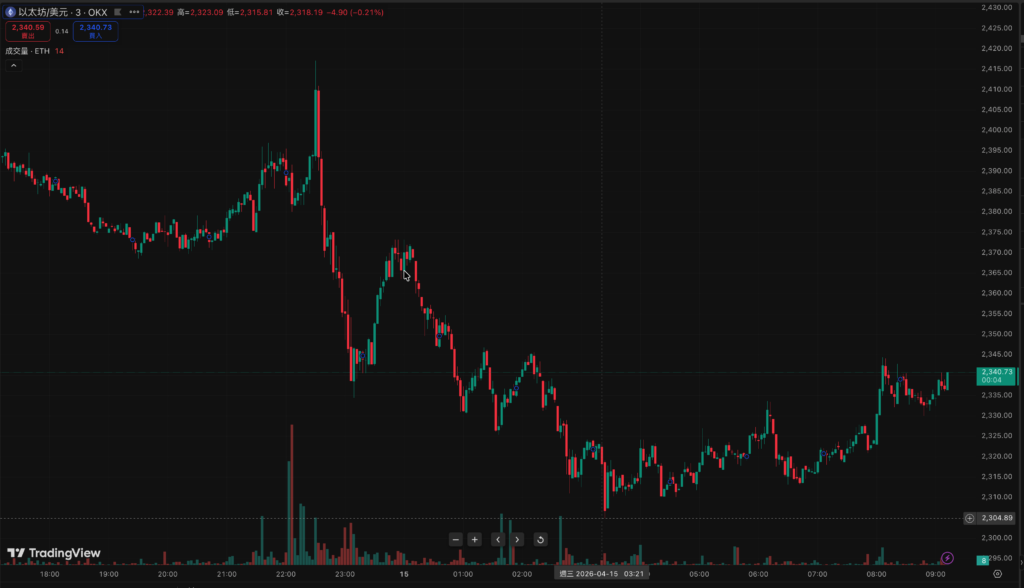 比特幣在封鎖生效後不跌反漲,昨日 4/14 觸及四週高點 $76,063,今日清晨站穩 $74,167(24h +0.40%、7 日 +4.50%),以太坊也同時從 $2,417 美元高點回調,現收 $2,343 美元。伴隨這波反彈的,是 $4.3355 億美元的空單被強制平倉,24 小時整體爆倉金額達 $4.34 億美元,涉及 18 萬名交易者,市場沒有因為封鎖令崩潰,反而用空頭的血完成了一次軋空。