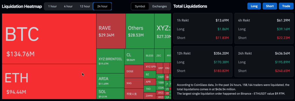 昨日 $4.3355 億美元的純空頭爆倉金額,驗證了軋空結構的完整性。地緣利空原本應該讓市場下跌,但在空頭過度擁擠的情況下,任何漲勢都會先消滅最脆弱的空頭部位,再由這些被迫平倉的買盤推動更多漲勢。