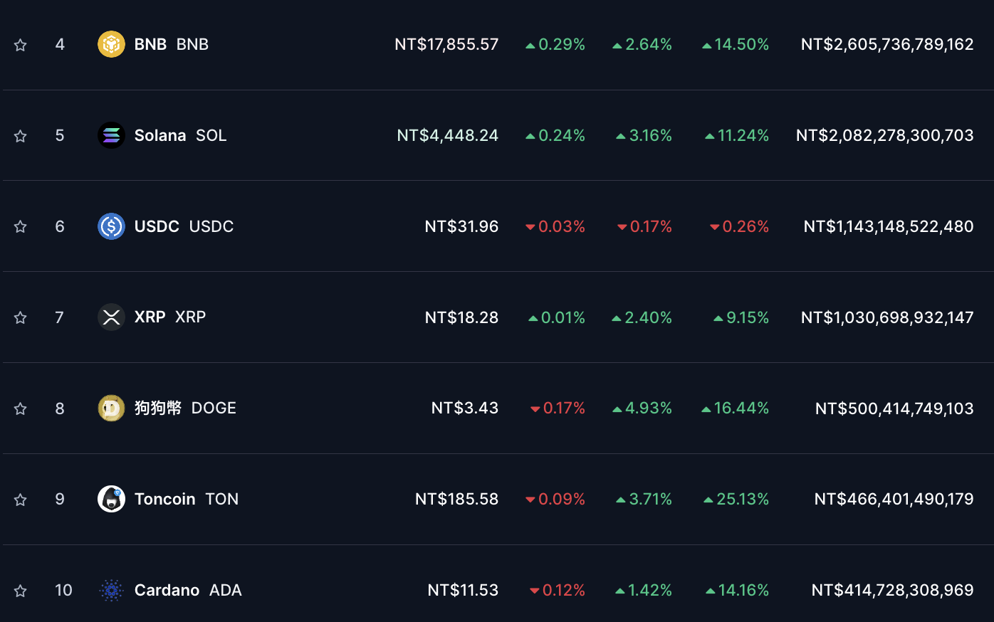 CoinMarkeCap 數據顯示,其他前十大代幣近 24 小時皆出現上漲,其中漲幅最大的為狗狗幣,上漲了 4.93%,其他代幣也都有約 1.5% 以上的漲幅,但皆不及比特幣的表現。