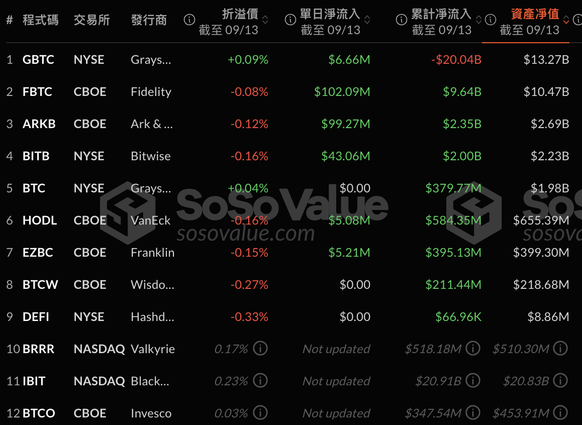 在比特幣單日漲近 5% 的同時,比特幣現貨 ETF 也出現亮眼數據。SoSo Value 數據顯示,比特幣現貨 ETF 昨(13)日總淨流入 2.6 億美元(截至目前更新的數據),其中富達的 FBTC 更單日吸金逾 1.02 億美元,創下 7 月 19 日以來單日資金淨流入新高。