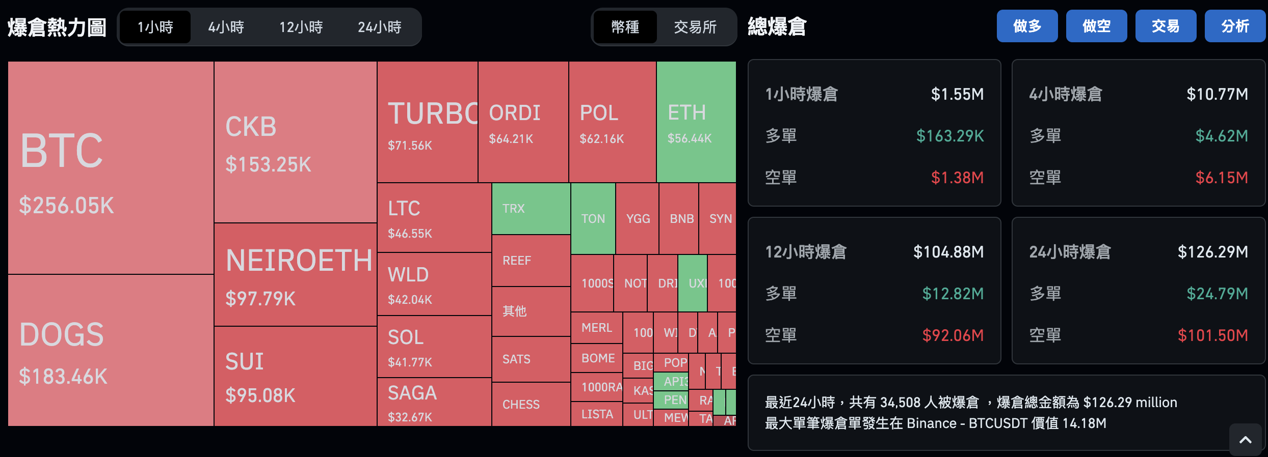 比特幣站回 6 萬美元的行情,使得加密貨幣市場主爆空單。據 Coinglass 數據顯示,過去 24 小時,加密貨幣全網爆倉金額超過 1.26 億美元,有超過 3.4 萬人遭清算。