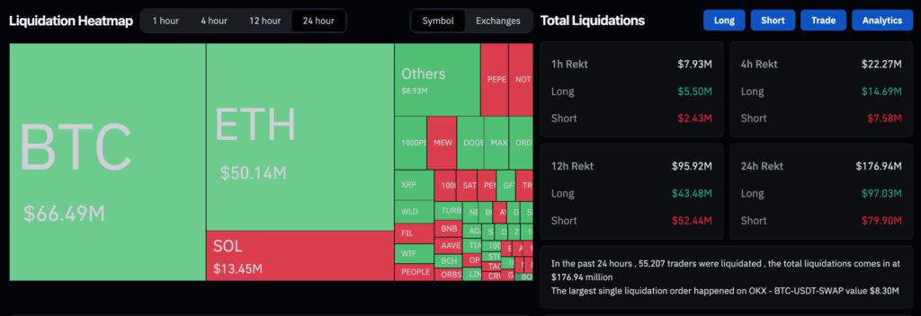 據 Coinglass 數據顯示,過去 24 小時,加密貨幣全網爆倉金額約 1.76 億美元,有超 5.5 萬人遭清算,相較昨天數據又更緩和一些。