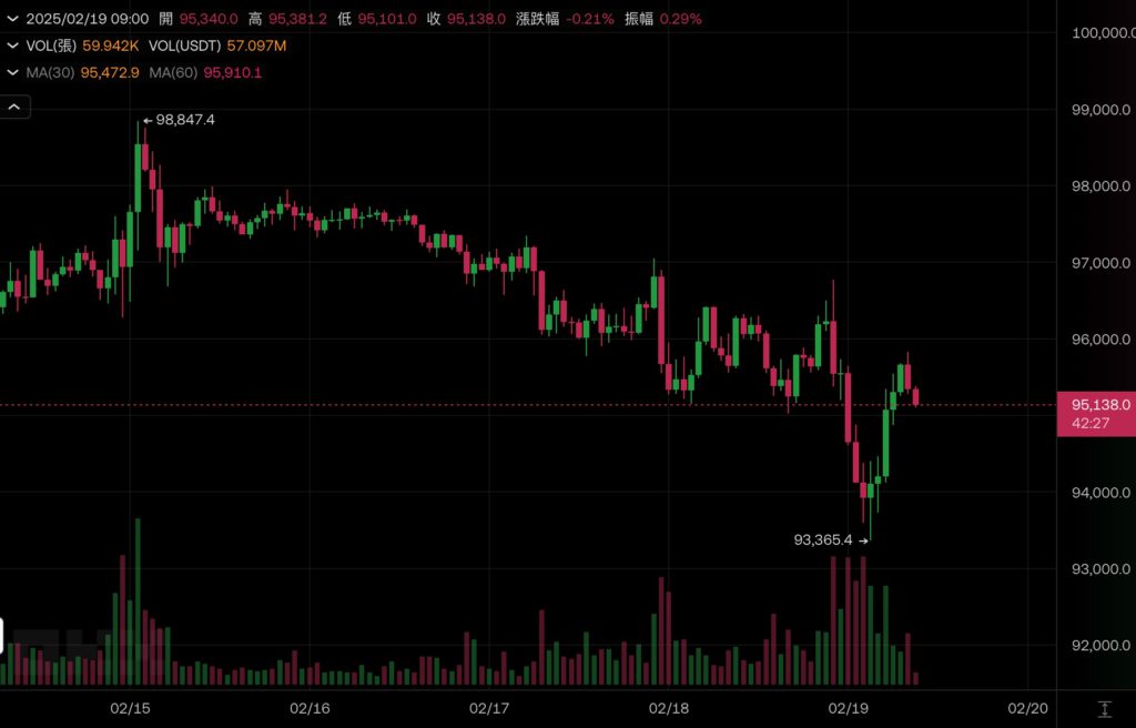 比特幣昨晚再次震盪走低,清晨三點後最低一度來到 93,365 美元,創下 2/3 以來新低。截稿前反彈回 9.5 萬美元之上,但仍未突破下降趨勢線,整體走勢還有待近一步確認。