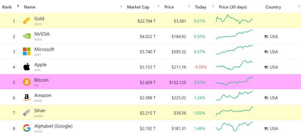 Bitcoin 觸及歷史高點 122,600 美元,市值達 2.4 兆美元,跨越亞馬遜 2.3 兆美元與白銀 2.2 兆美元,也壓過 Alphabet 的 2.19 兆美元。距離排在第四位的蘋果僅差 73 億美元,凸顯數位資產已躍升為不可忽視的全球性配置。