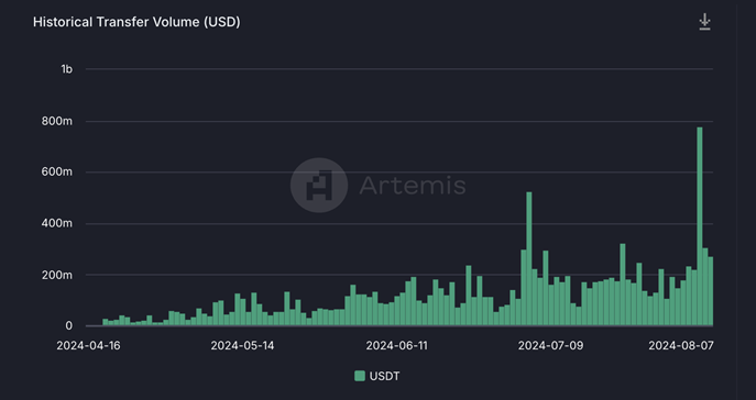 TON 生態的發展迅速,越來越多的項目和去中心化應用(DApps)利用其安全且可擴展的基礎設施。TON 主網上的 USDT 轉帳量持續激增,2024 年 8 月初的日均轉帳量已超過 7 億美元,這表明了用戶的強勁採用率和網路內流動性的擴大。
