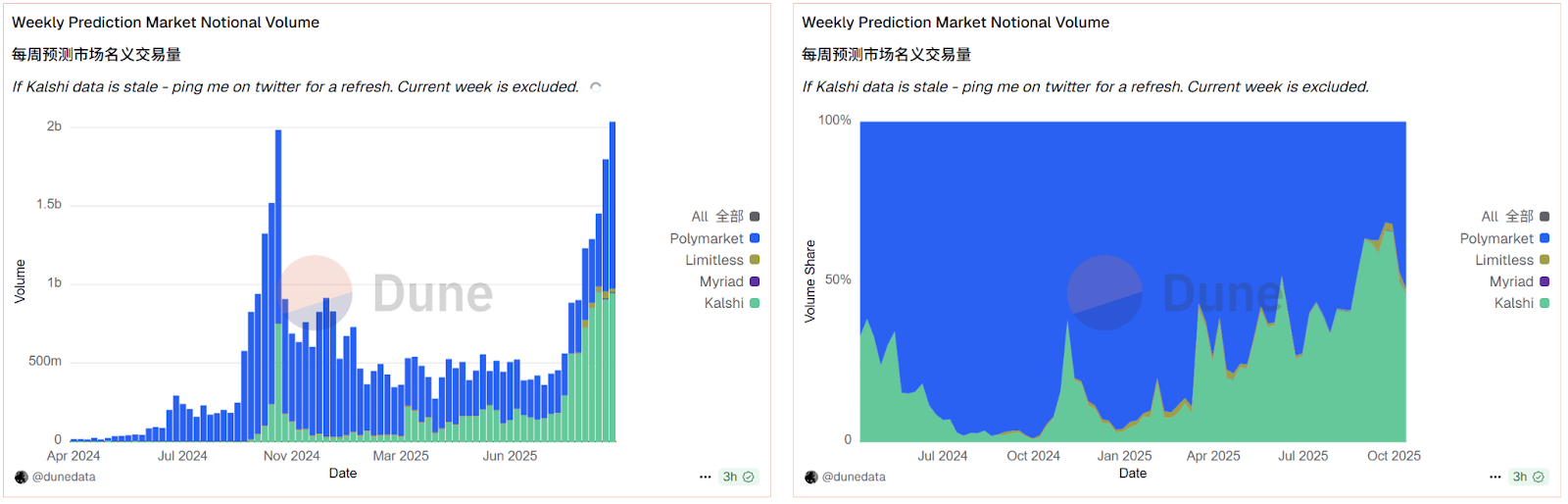 來自 Dune 平台的數據,直觀地印證了這一趨勢。 鏈上數據顯示,當前的加密預測市場已呈現出高度壟斷的「雙寡頭」格局:Polymarket 與 Kalshi 兩家巨頭瓜分了 95% 以上的市場份額。而在資本與監管的雙重利多刺激下,這個賽道正被整體活絡。10 月中旬,預測市場的單週交易總額突破 20 億美元,一舉超過了 2024 年美國大選之前的歷史峰值。在這輪爆發式增長中,Polymarket 憑藉其監管上的關鍵突破和潛在的代幣預期,暫時在與 Kalshi 的激烈競爭中略佔優勢,進一步鞏固了其頭部地位。